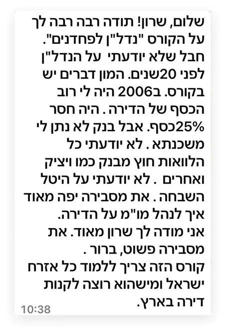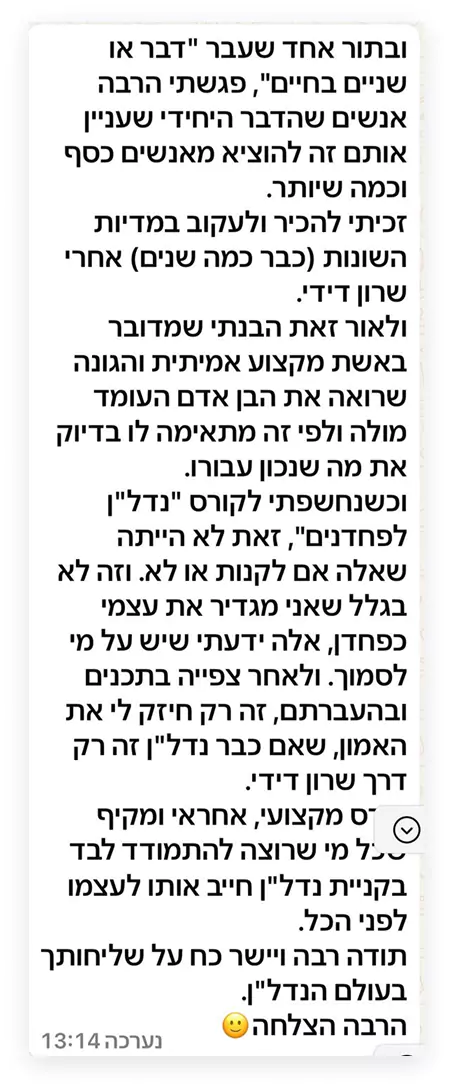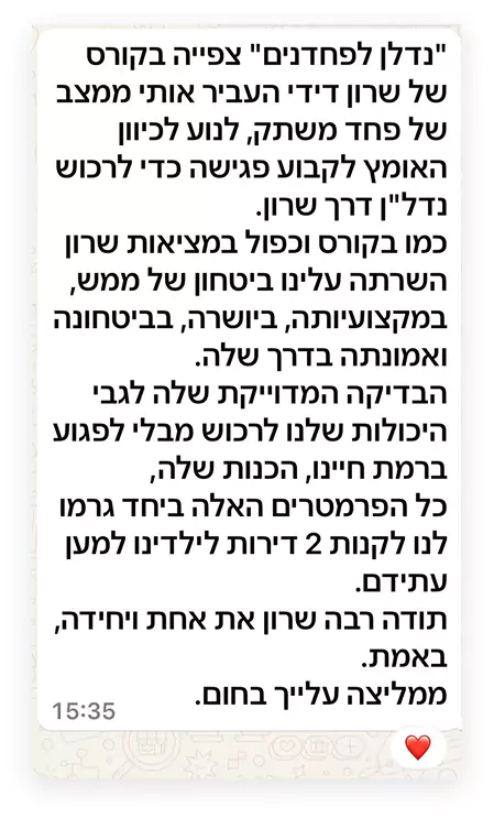 היום אני מסוגלת לעזור לילדים שלי לרכוש דירות בישראל- וגם זאת מטרה שמושגת ברוך השם והכל בזכות השיטה שלי ובזכות הפחדים שלי שבזכותם נכתב הספר "נדל"ן לפחדנים".
